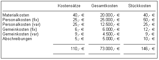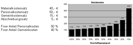 Im Folgenden sind die Stückkosten und die Gesamtherstellungskosten einer Spiel-Periode bei 100%iger Kapazitätsauslastung (1000 Stück) und bei einer Auslastung von 50% (500 Stück) gegenübergestellt.
