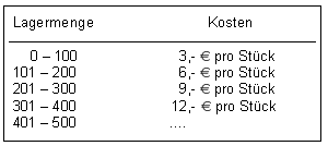 Beispiel: Für 120 Stück müssen 100 x 3 Euro + 20 x 6 Euro= 420 Euro/Periode gezahlt werden.